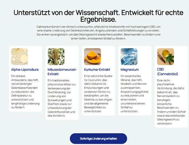 Calmea Kapseln Deutschland sind einnehmbare Nahrungsergänzungsmittel, angereichert mit hochwertigem Cannabidiol aus Bio-Hanfpflanzen. Diese Produkte wurden als praktische und wohlschmeckende Alternative zu Calmea und Tinkturen entwickelt und fördern sowohl das körperliche als auch das geistige Wohlbefinden ohne die mit THC (Tetrahydrocannabinol) verbundenen psychoaktiven Wirkungen. Calmea liefert eine präzise dosierte Calmea-Dosis, sodass Anwender die Vorteile des Hanfextrakts mühelos und präzise erleben können. Calmea wird als Lösung zur Stressreduzierung, Angstlinderung, Schmerzbehandlung und Schlafunterstützung vermarktet und spricht ein breites Publikum an – von überlasteten Berufstätigen bis hin zu älteren Menschen, die natürliche Schmerzlinderung suchen.