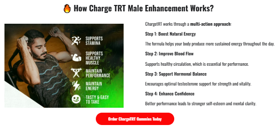 ChargeTRT operates by utilizing a combination of natural ingredients specifically selected to support prostate health, alleviate symptoms associated with an enlarged prostate, and enhance overall urinary function. This is the manner in which Charge TRT Male Enhancement operates: