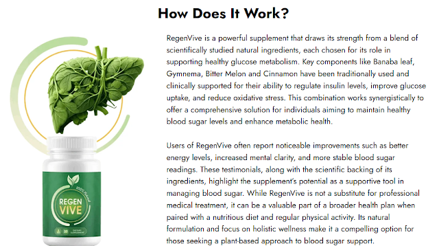 Regenvive Blood Sugar Support active components cooperate to control blood sugar levels and enhance insulin sensitivity. A closer look at the product's operation is provided here.Increasing Sensitivity to Insulin Enhancing the body's reaction to insulin is one of Regen Vive's main purposes. Because it facilitates the absorption of glucose by cells, the hormone insulin is essential for regulating blood sugar levels. Increased insulin sensitivity lowers the risk of blood sugar rises by improving the body's ability to regulate glucose levels.Controlling Glucose Metabolism Regen Vive promotes a healthy metabolism of glucose, which helps guarantee that the body uses it efficiently for energy rather than storing it as fat. This can help with weight control, which is frequently difficult for those with blood sugar problems.