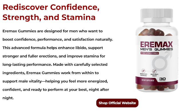 Eremax Gummies USA is designed for men aiming to naturally elevate their energy, libido, and overall wellness without the inclusion of stimulants. Marketed under the name Eremax, it employs a multi-phase plant-based delivery system that ensures optimal absorption of the components. The effects manifest gradually but are sustained over time, setting it apart from competitors that rely on short-lived results. Eremax seeks to enhance your body's inherent processes, whether you are experiencing fatigue, anxiety, or diminished confidence.