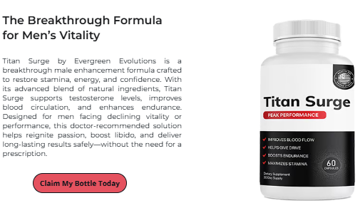 Titan Surge Capsules is an enhancement solution that employs a blend of clinically validated ingredients to aid men in reclaiming their vitality, endurance, and enhancing their experiences. The producer asserts that it can offer a temporary elevation in capability and strength while also addressing the fundamental causes of erectile challenges, thereby ensuring lasting satisfaction for partners. Titan Surge Capsules is advertised as a powerful remedy for three essential issues that influence performance: penile size, stamina, and pleasure. The product contains a potent combination intended to bolster these factors. According to the manufacturer, Titan Surge Capsules can assist men in achieving gratifying experiences and satisfying their partners. Titan Surge Capsules is depicted as a solution for improving penis size, endurance, and pleasure due to its nutrient-dense formulation. The manufacturer claims that the product can enable men to fulfill their partners' needs during intimate encounters.