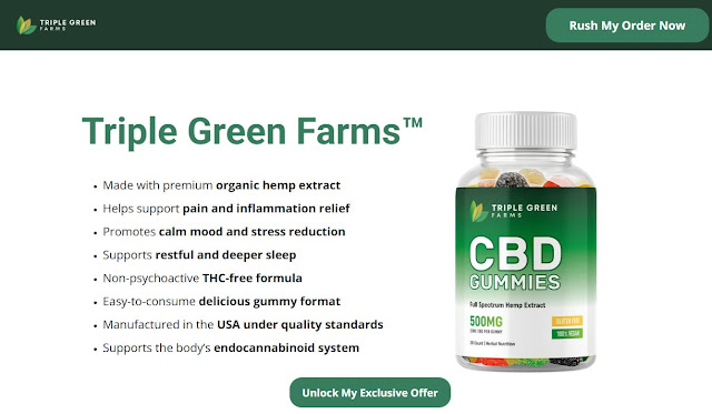 Triple Green Farms CBD Gummies has the potential to transform your overall health and wellness. This unique investment yields lasting results and benefits due to its entirely natural and scientifically validated ingredients. For additional information and to place an order for this product, you should visit its official website, linked here. Triple Green Farms can be found through various e-commerce platforms, reputable CBD vendors, and select health food stores. It is crucial to procure from trustworthy sources to ensure the quality and efficacy of Triple Green Farms.
