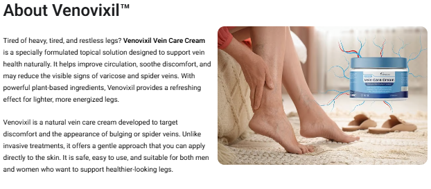 Venovixil Official Website is a topical vein-support formulation designed with botanical extracts and soothing agents to promote comfort, enhance circulation, and yield smoother-looking legs. It is not intended to replace medical vein treatments; however, many users find it advantageous as part of a consistent daily leg care regimen.