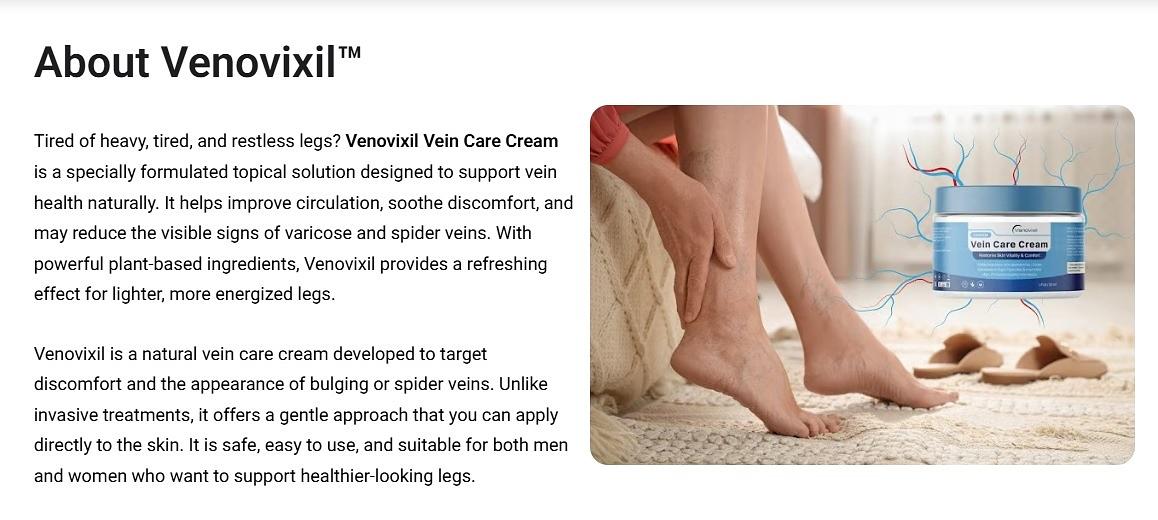 Venovixil is a specifically developed topical formulation intended to enhance vein wellness and improve the overall comfort and appearance of the skin. It is designed for individuals who experience prominent veins, fatigued legs, or a sense of heaviness resulting from prolonged periods of standing or sitting. By integrating skin-replenishing components with mild botanical extracts, Venovixil Cream New Zealand strives to provide focused care directly to the impacted regions. The cream penetrates effortlessly into the skin, offering a calming and revitalizing sensation while assisting in sustaining hydration and elasticity. Unlike intrusive procedures or complicated regimens, Venovixil Official Website presents a straightforward, non-invasive solution for daily vein care. With frequent application, it may promote smoother skin and a more comfortable leg experience.